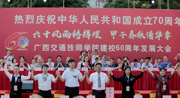 甲子轮回,忆往昔峥嵘岁月风雨同舟,六十华诞,看今朝日新月异百舸争流。广西交通技师学院已走过了60年的光辉历程,2019年9月28日上午,广西交通技师学院在邕武校区隆重举行建校60周年改革发展成果展系列活动。系列活动包括教学成果展、学生技能成果展、校企合作座谈会、校友座谈会、文艺汇演。