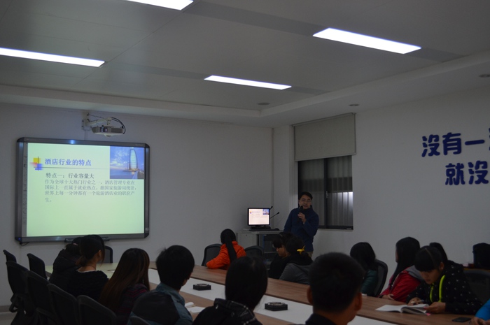 12月12日,我院信息与商务系邀请喜相逢大酒店(四星级)销售总监蔺宝东到我院为13级旅游与酒店管理专业的学生进行专业授课。