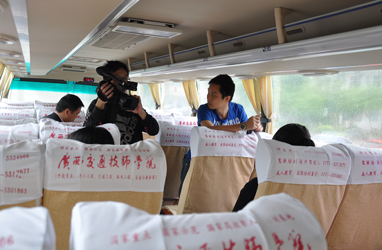 广西电视台记者和我院骆任芳老师以体验者的身份参与到了这次拍摄过程中,为了使体验感受更加真切,电视台记者系好安全带,骆任芳老师特意不系安全带,客车司机则模拟车辆在行驶时遇到的各种复杂路况进行急刹、急速转弯等各种突发性驾驶,让人始料不及的是,骆任芳老师不但多次碰撞前座的靠背,而且膝盖也撞到了前座坐垫下的铁杠,甚至整个人跌出了走道;而广西电视台体验记者则坐得稳稳当当,安然无恙。模拟体验结束后,记者问及骆任芳老师对这次体验活动的感受,她说:“这次乘车虽然是模拟体验,但真的让人很紧张,多次出现的碰撞以及跌出走道让我真正意识到,乘车过程中存在着很多潜在的危险,我们要防患于未然才能避免这些事故的发生,所以乘车系安全带真的很重要。”